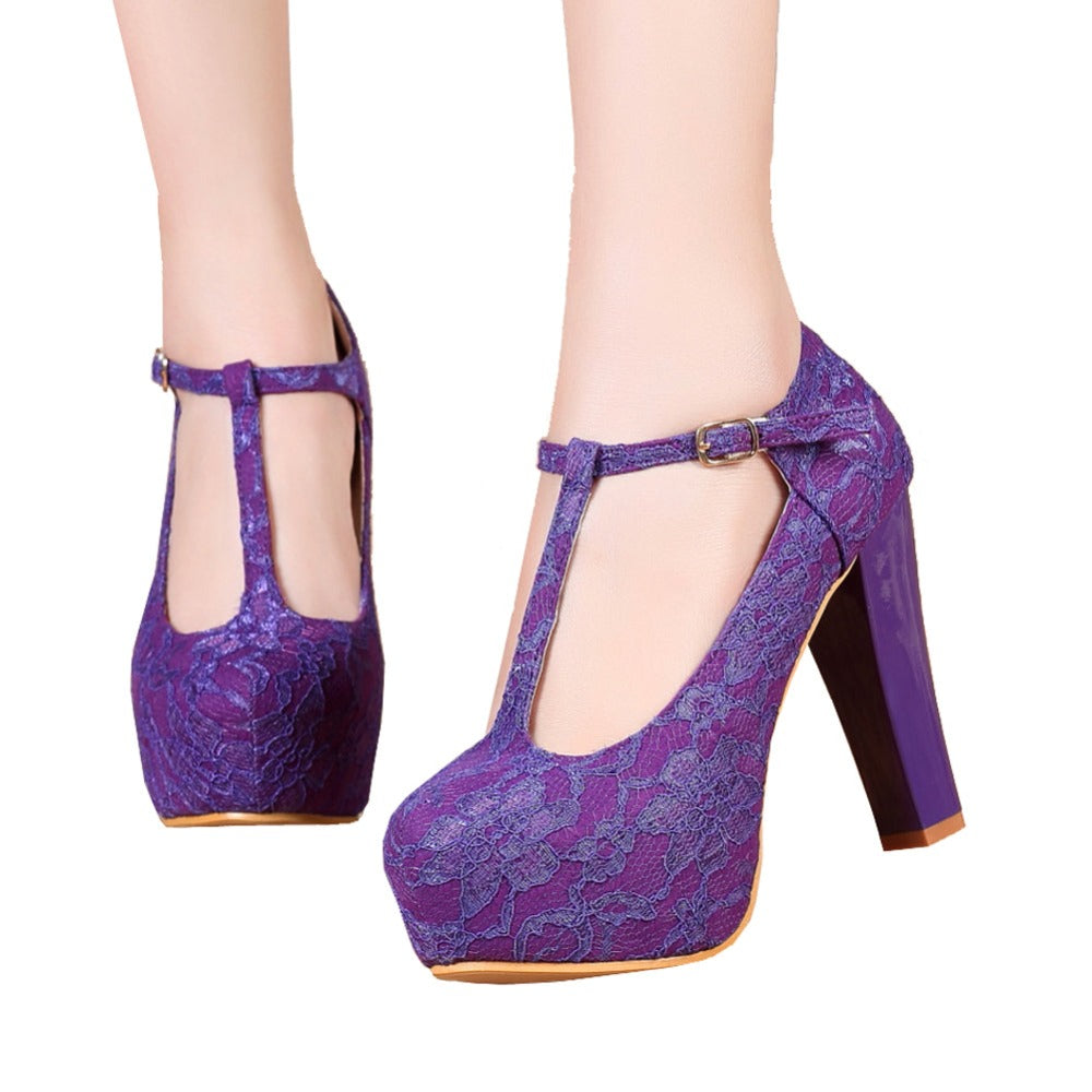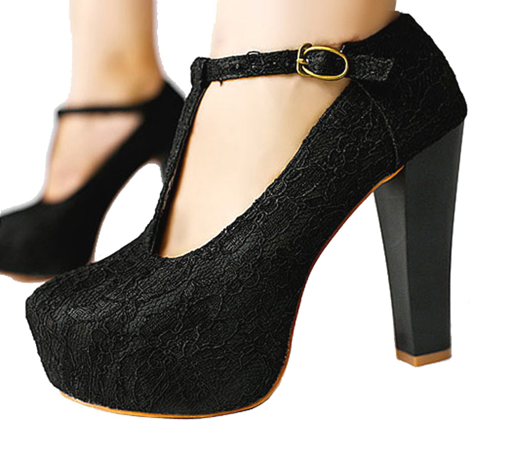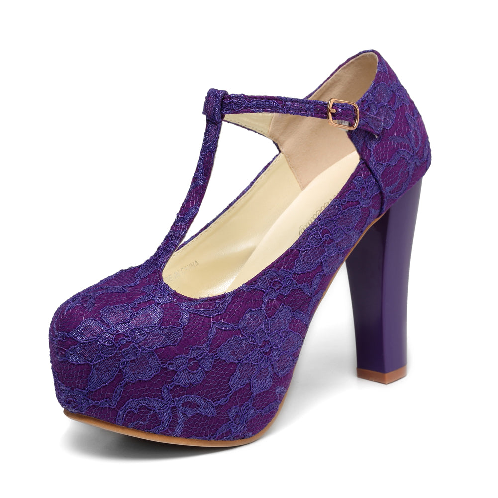 Women's T-Strappy Dress Mary Janes Lace Wedding Shoes High Heels